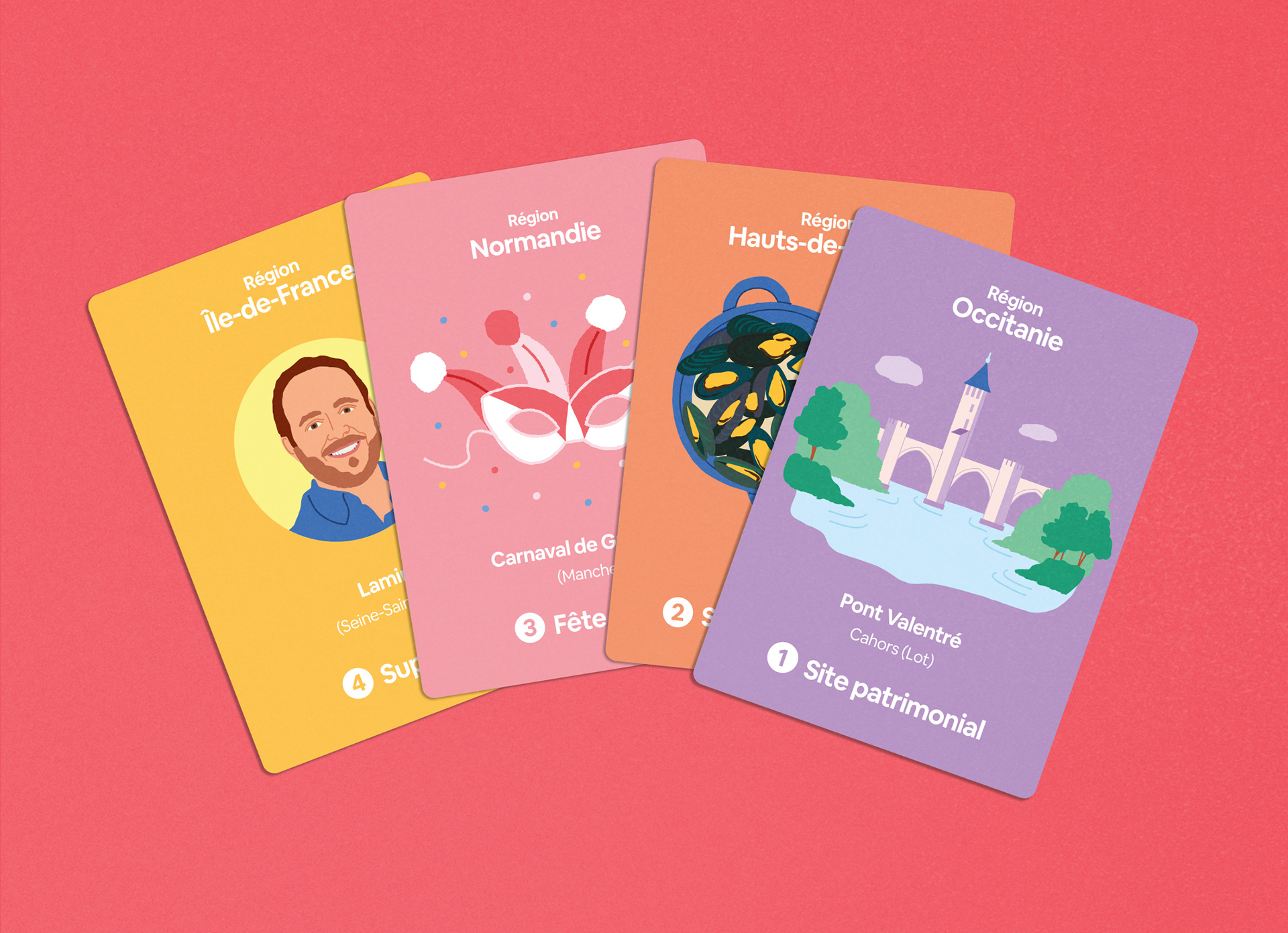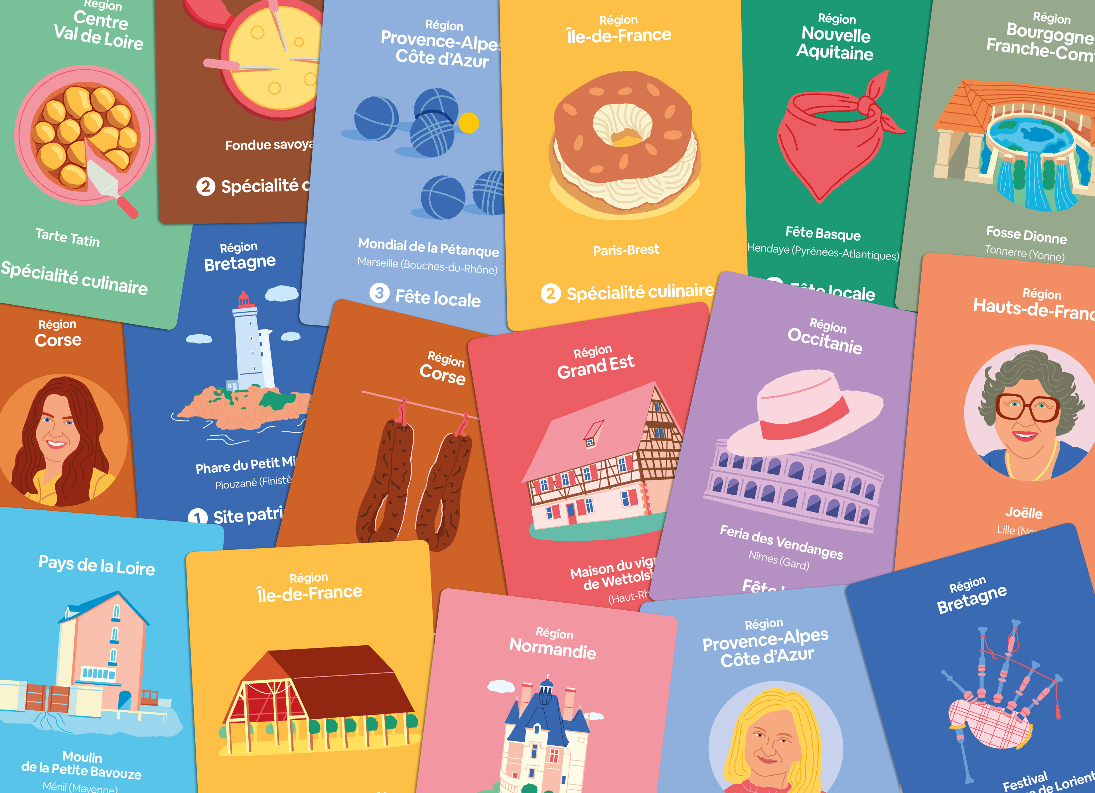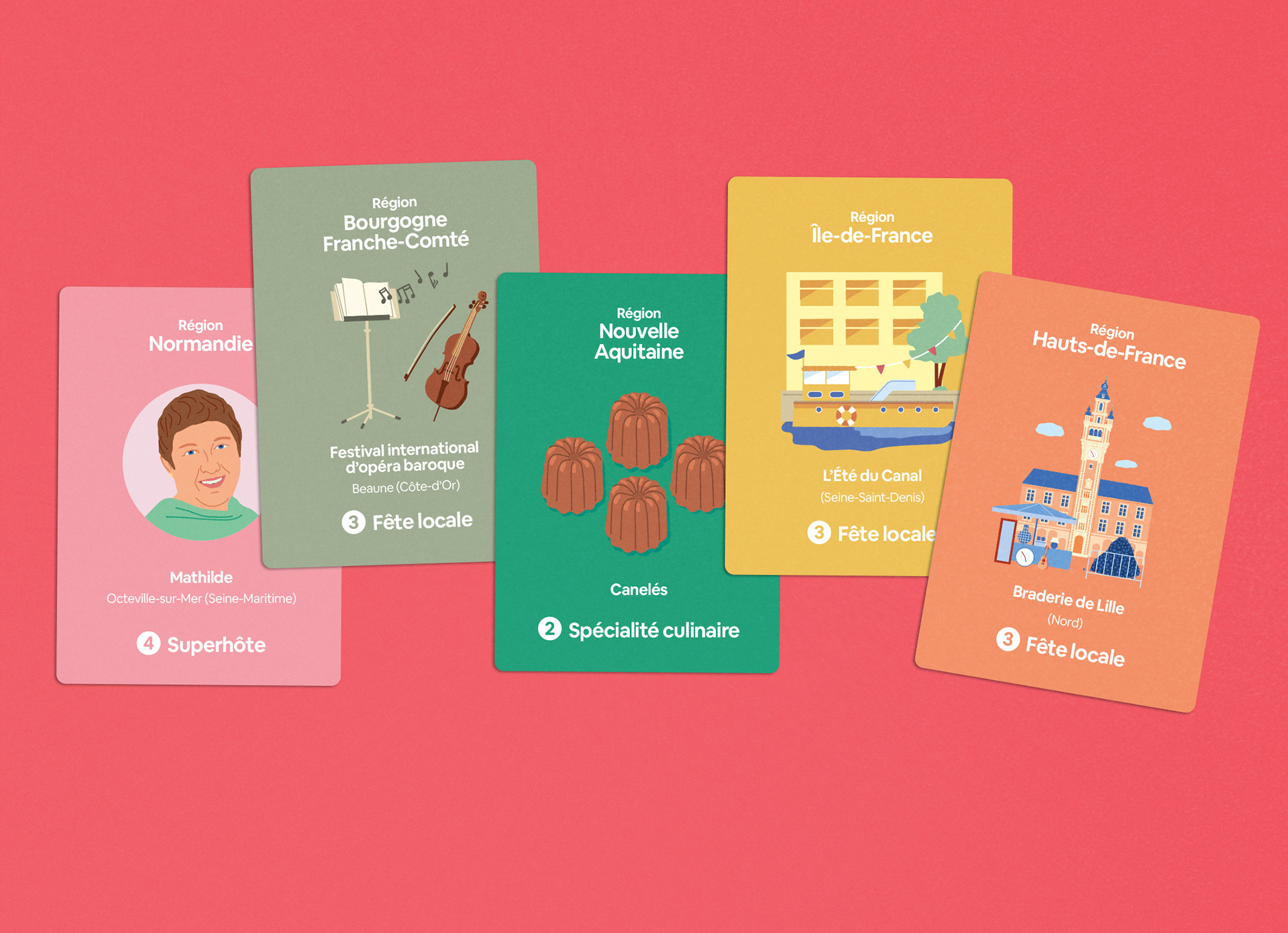 Création d'un jeu de cartes illustré pour une plateforme de location de logements entre particuliers, à l'occasion du Salon des maires (2025). Il met en valeur les superhôtes du réseau, les fêtes locales, les spécialités culinaires et les sites patrimoniaux de chaque région.